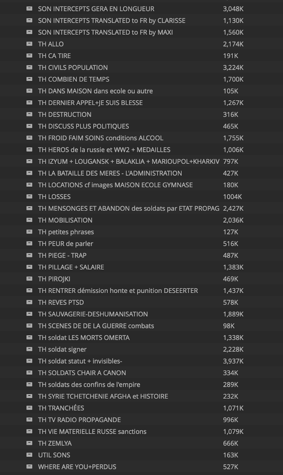 Lorsque j’ai rencontré Oksana, elle était en train de réécouter pas loin de 1000 conversations parmi lesquelles elle a fait un premier choix d’environ 400, ce qui représentait une dizaine d’heures de matériel audio. Après un test de traduction automatique peu concluant, la production a fait appel à deux traducteurs professionnels qui étaient encore au travail quand nous avons débuté.